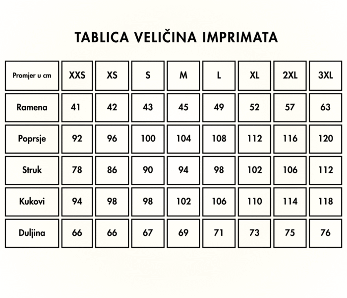 | Promjer u cm | XXS | XS | S | M | L | XL | 2XL | 3XL |